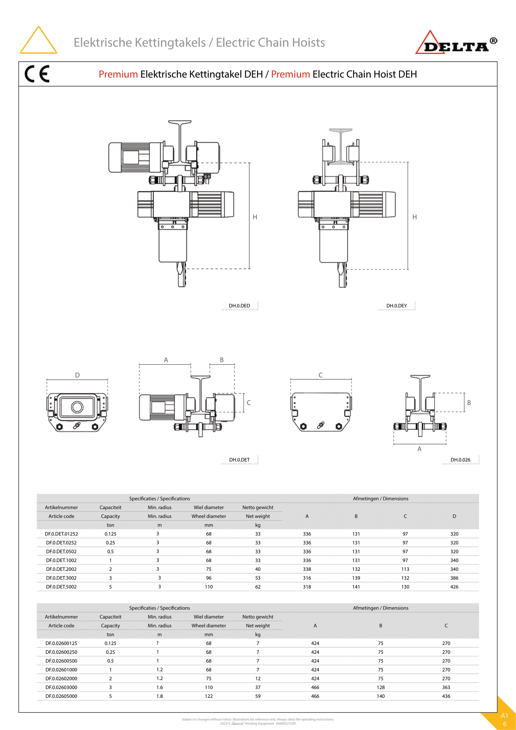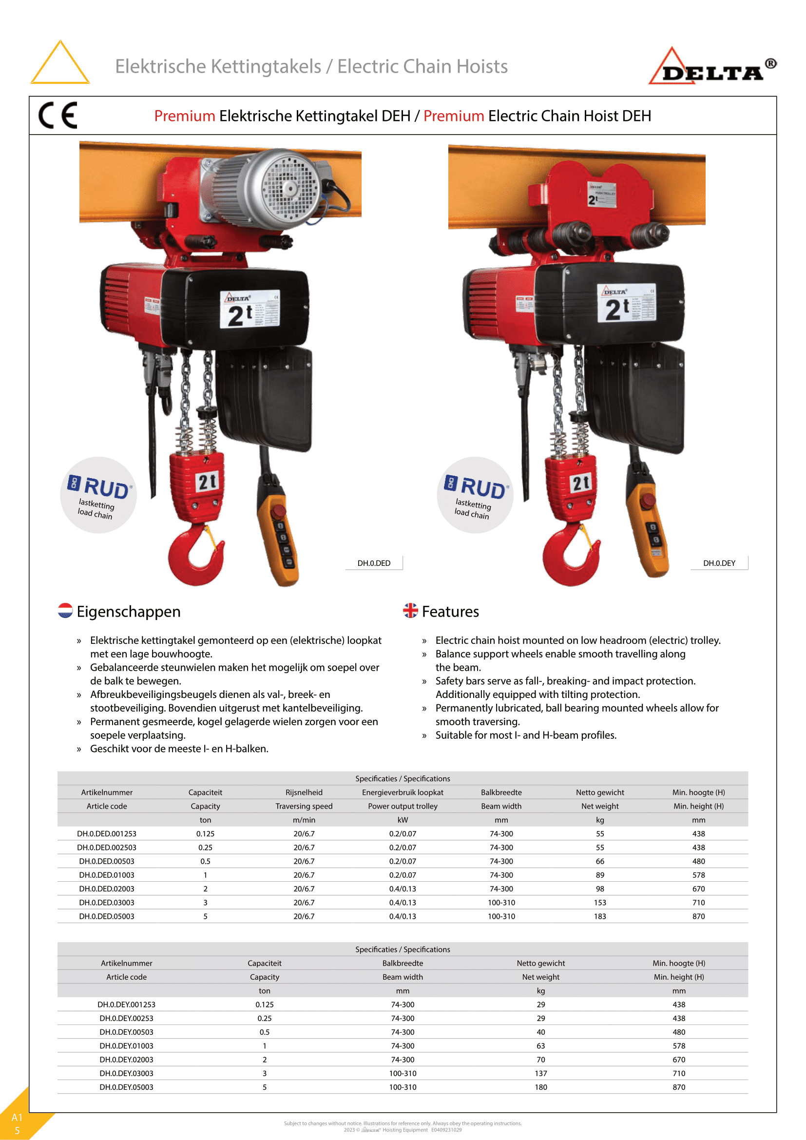 Delta DEH-ketjunostimia on saatavana koukkuripustuksella tai integroiduilla sähkö- tai manuaalisiirtovaunuilla. Valikoimassa on kolmivaiheisia nostimia 0,125 – 5 tonnin kapasiteetille. Delta ketjunostimet ovat erittäin matalarakenteisia ja säästävät nostokorkeutta matalissa tiloissa. Nostimia saa eri nostonopeuksilla sekä yksi- tai kaksiketjuisena. Kaikki mallit on varustettu 24V-ohjausjännitteellä ja SIEMENS kontaktoreilla.
